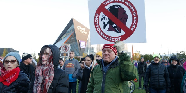 FILE - In this Oct. 24, 2019, file photo, Native American leaders protest against the Redskins team name outside U.S. Bank Stadium before an NFL football game between the Minnesota Vikings and the Washington Redskins in Minneapolis. Several Native American leaders and organizations have sent a letter to NFL Commissioner Roger Goodell calling for the league to force Washington Redskins owner Dan Snyder to change the team name immediately. (AP Photo/Bruce Kluckhohn, File)