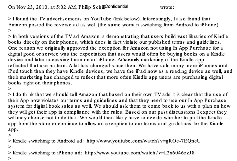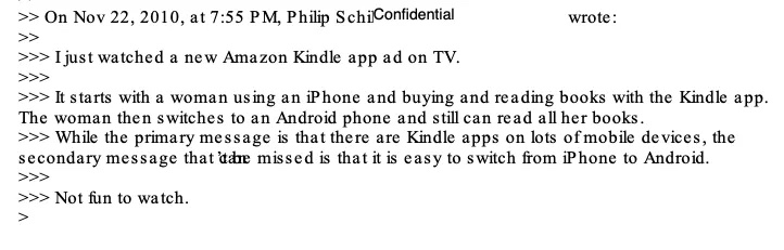 In fact, what actually prompted Schiller to reinvestigate this situation, according to the emails, is that Amazon ran a series of advertisements on how you could still access your Kindle books if you switched from iPhone to Android or vice versa. In one email, Schiller wrote: