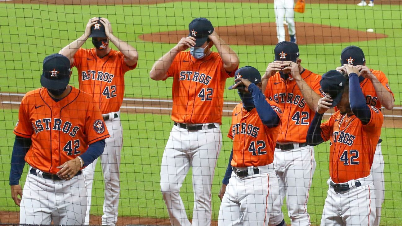 A's shortstop Marcus Semien and Astros catcher Martin Maldonado each placed a No. 42 jersey from their respective teams in the batter's boxes. Houston starters took their positions, with other players on both sides lining up in front of their dugouts. After a moment of silence, the teams walked back to their clubhouses.