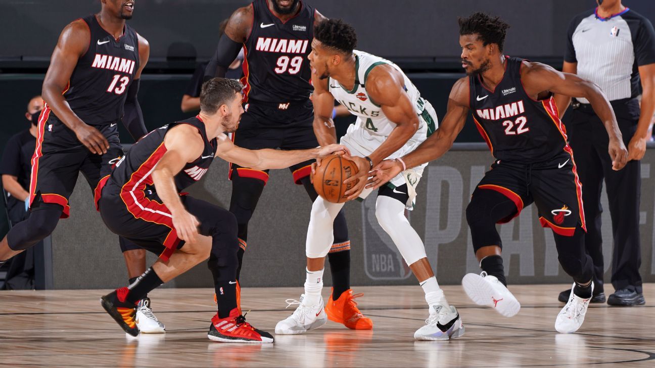 Have the Miami Heat managed to find the holes in Giannis Antetokounmpo's game? For the second consecutive postseason, the Milwaukee Bucks' MVP is struggling to provide the same impact as he did during a dominant regular season -- which was true before he tweaked his ankle during Game 3.